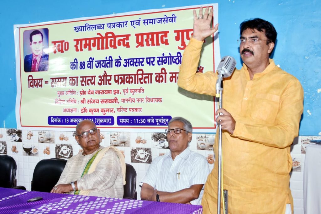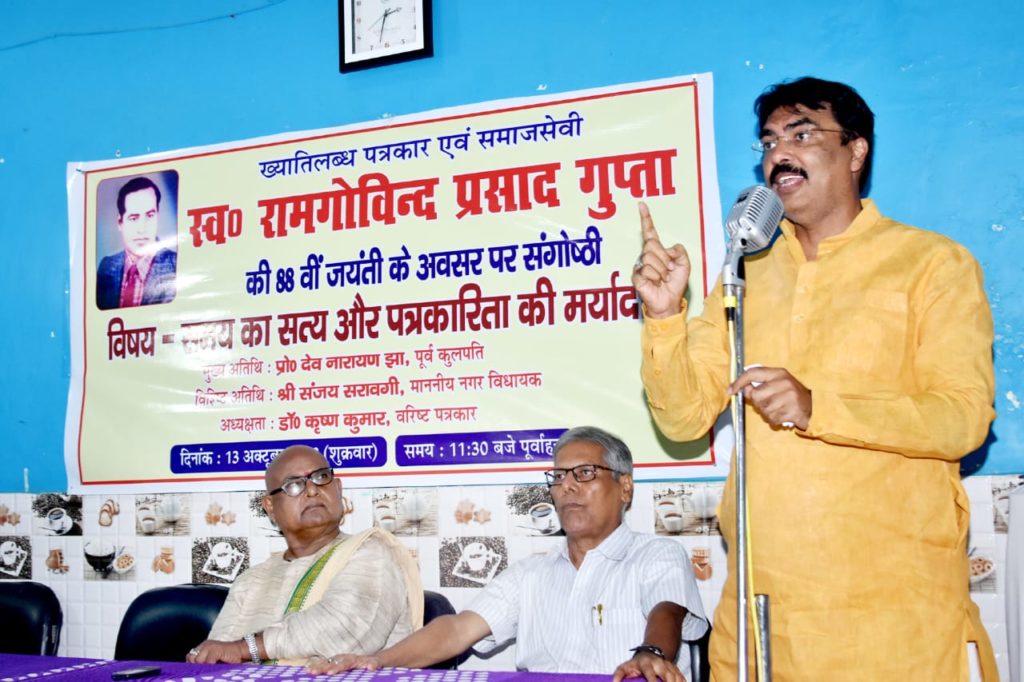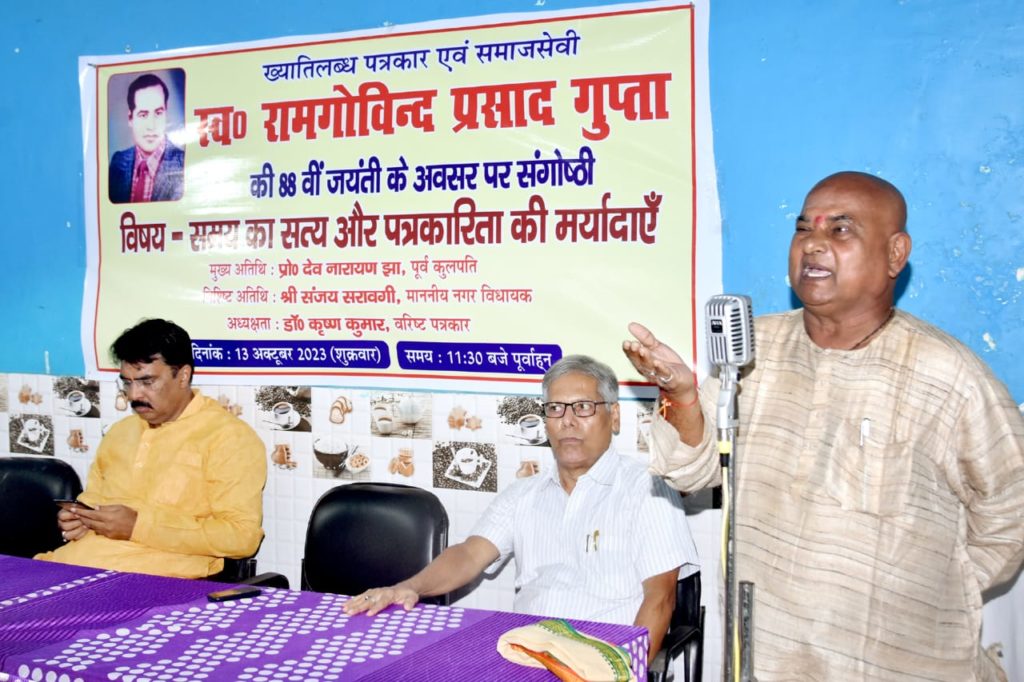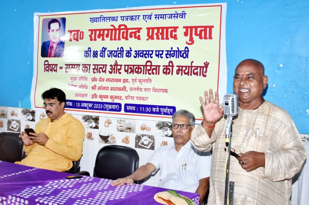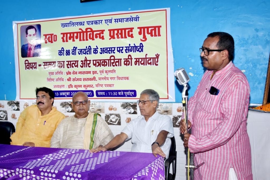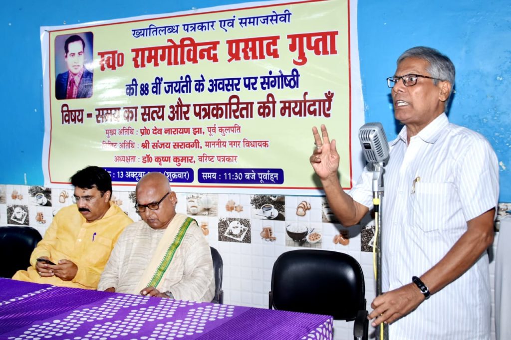 ख्यातिलब्ध पत्रकार एवं समाजसेवी स्वर्गीय राम गोविंद प्रसाद गुप्ता की 88वीं जयंती के अवसर पर शहर के दोनार चौक स्थित सागर फैमिली रेस्टोरेंट के सभागार में “समय का सत्य और पत्रकारिता की मर्यादाएँ” विषयक संगोष्ठी को संबोधित करते हुए प्रोफेसर झा ने कहा कि सत्य को उजागर करनेवाले पत्रकारिता का पथ कांटों भरा है। इसी पथ पर चलकर पत्रकार समय के सत्य को मर्यादा के साथ प्रस्तुत करते हैं। उन्होंने विषय-वस्तु की अक्षरसः व्याख्या कर बताया कि सत्य सदैव सत्य ही रहता है पर समय के प्रभाव से बस नजरिया बदल जाता है। उन्होंने कहा कि शासक के पास अपना नेत्र नहीं होता वो दूसरों के नेत्र से राष्ट्र को देखता है और पत्रकारिता समाज का चक्षु है जो वर्तमान यथार्थ को अपनी लेखनी से उजागर करता है। प्रोफेसर झा ने कहा कि मर्यादा का पालन आवश्यक है इसलिए सत्य की कटुता से परहेज वर्तमान दौर का यथार्थ बन गया है। इस स्थिति में पत्रकारिता की भूमिका महती हो गई है। पत्रकारिता के ऊपर समाज के आदर्श को यथावत बरकरार रखने के साथ ही सत्ता को निरंकुश बनने से रोकने की दोहरी जिम्मेदारी होती है। प्रोफेसर झा ने कहा कि पत्रकारों की भूमिका राजसत्ता पर अंकुश लगाने में है। उन्होंने पत्रकारों का आह्वान करते हुए कहा कि लोकतंत्र को जीवित रखने में आप अपनी भूमिका पूरी ईमानदारी एवं निष्ठा के साथ बरकरार रखें। विपरीत परिस्थितियों में भी रहते हुए आप सत्य को सामने लाते हैं हम इसके लिए आपको शुभकामना देते हैं।