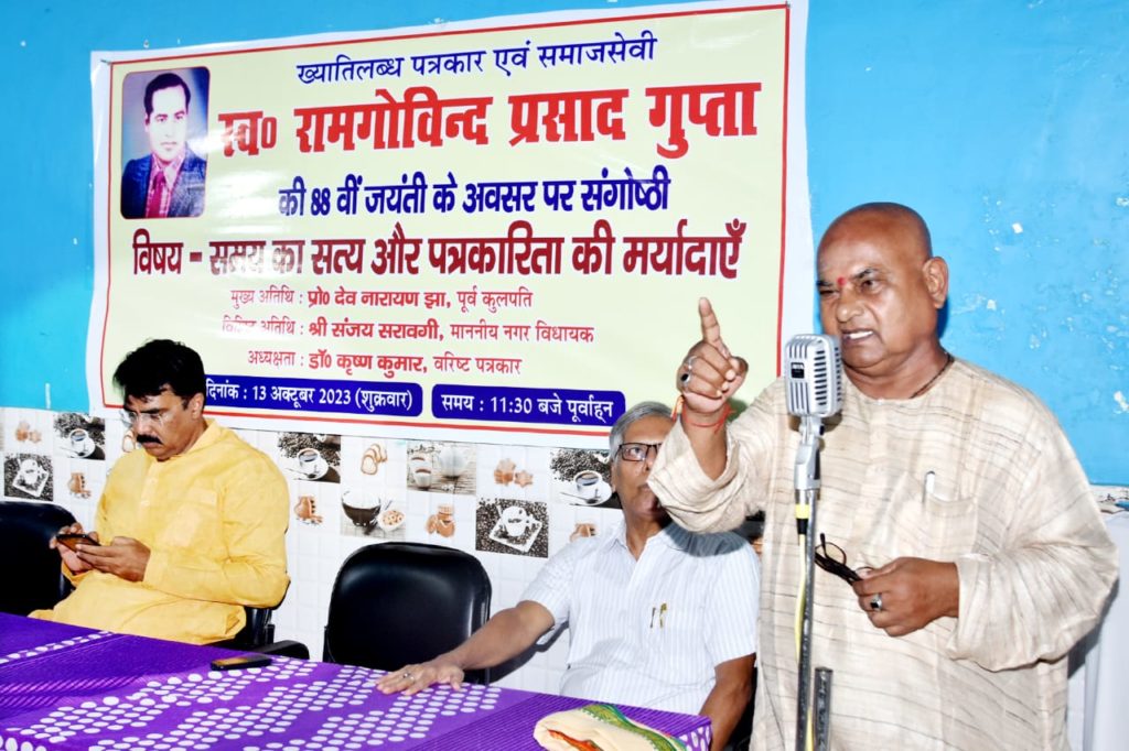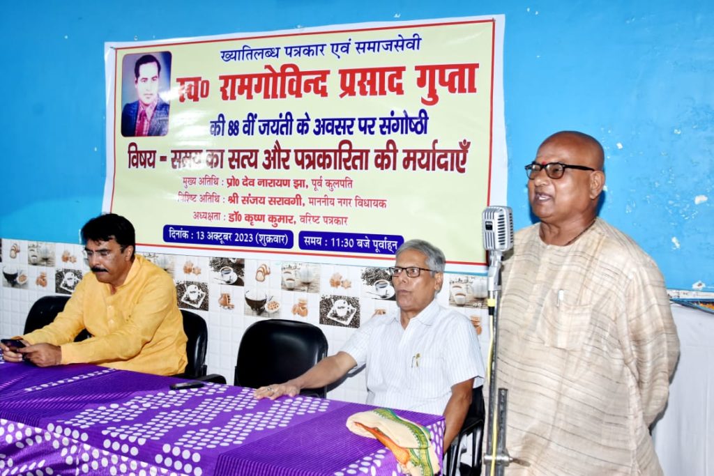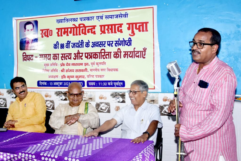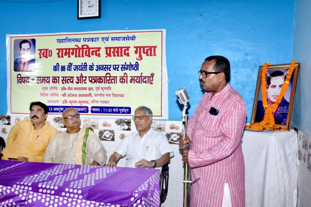 जबकि नवीन सिंहा ने कहा कि सत्य को व्यक्त करने पर पहले भी पत्रकार उत्पीड़ित होते थे और आज भी यह दौर जारी है।जबकि अध्यक्षता करते हुए हिन्दी के सेवानिवृत्त प्रोफेसर और पत्रकार डॉ कृष्ण कुमार ने कहा कि सच्चा पत्रकार हमेशा पत्रकारिता की गरिमा का ख्याल रखता है। यह प्रवृत्ति आज भी बरकरार है। इससे पूर्व संगोष्ठी का आरंभ अतिथियों ने स्व० रामगोविंद प्रसाद गुप्ता की तस्वीर पर पुष्प अर्पण से किया। जबकि संगोष्ठी में विषय प्रवेश प्रो रामचंद्र सिंह चन्द्रेश ने कराया। उन्होंने कहा कि सत्य हमेशा सत्य होता है समय भले बदलता रहता है।