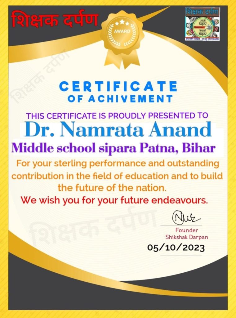 राजकीय-राष्ट्रीय सम्मान से अंलकृत शिक्षका डा. नम्रता आनंद को शिक्षा के क्षेत्र में उल्लेखनीय योगदान के लिये शिक्षक दर्पण परिवार ने सम्मानित किया है।
